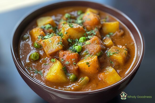 Key Ingredients: Mixed vegetables (cauliflower, carrots, green beans), coconut milk, garam masala, and ginger-garlic paste.
