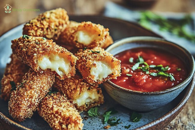 Tip: Make sure your mozzarella sticks are completely frozen before breading. This helps the coating stick and keeps the cheese from oozing out too soon.